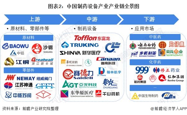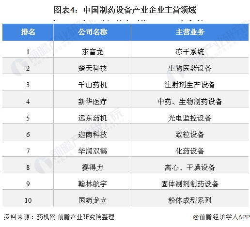 中游代表性企业主要有东富龙、楚天科技、新华医疗、迦南科技、千山药机和新华等众多制药设备厂商;