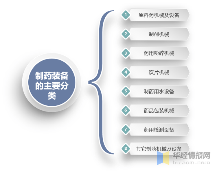 根据国家标准,制药装备主要可分为原料药机械及设备、制剂机械、药用粉碎机械、饮片机械、制药用水设备、药品包装机械、药用检测设备及其它制药机械及设备八大类。