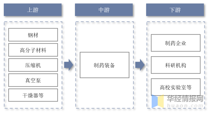 制药装备行业产业链上游为原材料及零部件环节,主要包括钢铁、机械零部件及电气零部件行业;中游为制药装备生产供应环节;下游主要应用于制药企业、科研机构及高校实验室等。