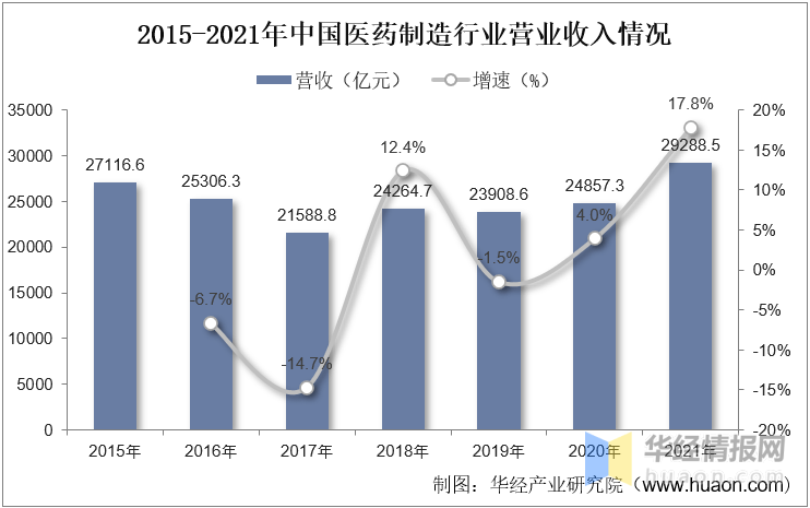 医药制造行业来是制药装备下游应用领域,2016年医药制造业由于受到一系列政策调控和企业转型的影响,药品价格受到严格监管和控制,行业整体营业收入出现下滑,随后市场竞争环境改善,营业收入逐渐恢复增长趋势。据资料显示,2021年我国医药制造业的营业收入为29288.5亿元,同比增长17.8%。
