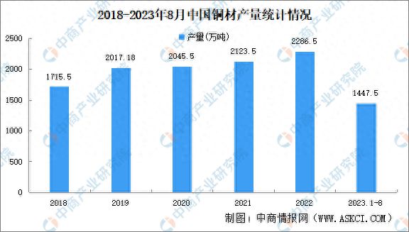 中商产业研究院发布的《2019-2023年中国铜材市场前景调查及投融资战略研究报告》显示,2022年中国铜材产量2286.5万吨,同比增长5.7%。2023年1-8月,中国铜材产量1447.5万吨,同比增长6.1%。