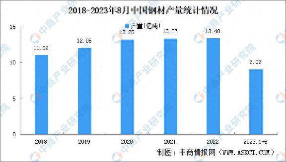 中商产业研究院发布的《2022-2027年中国钢材行业市场分析及发展趋势预测报告》显示,2022年中国钢材产量13.40亿吨,同比减少0.8%。2023年1-8月,中国钢材产量9.09亿吨,同比增长6.3%。