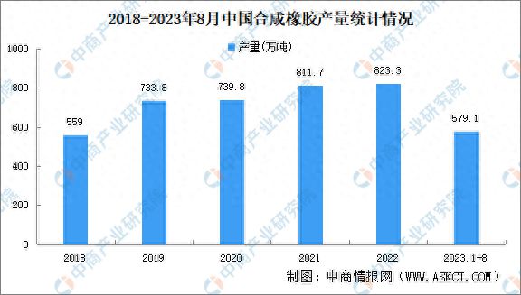 近年来,我国合成橡胶产量呈现稳步增长的趋势。中商产业研究院发布的《2022-2027年中国合成橡胶行业市场深度分析及发展趋势预测报告》显示,2018年我国合成橡胶产量559万吨,2022年增至823.3万吨,复合年均增长率10.2%。2023年1-8月,我国合成橡胶产量579.1万吨,同比增长8.8%。