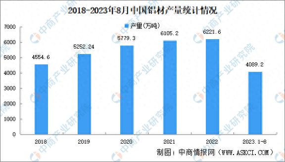 中商产业研究院发布的《2018-2023年互联网+铝材市场前景研究报告》显示,2022年中国铝材产量6221.6万吨,同比减少1.4%。2023年1-8月,中国铝材产量4089.2万吨,同比增长4.3%。