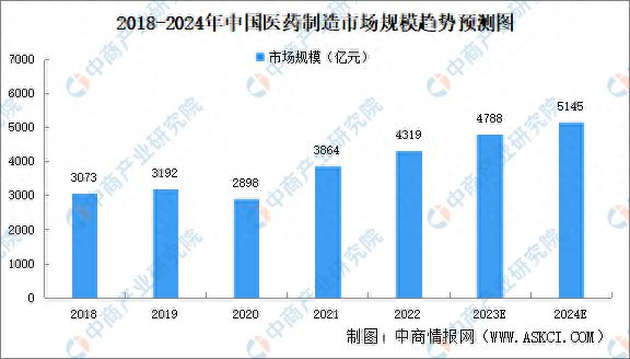 中商产业研究院发布的《2024-2029年中国医药制造行业深度分析及“十四五”发展机会研究报告》显示,中国医药制造市场规模由2018年3073亿元增至2022年4319亿元,复合年均增长率为8.9%。考虑到我国经济的持续增长和人均收入水平的提高、人口老龄化的加快、城镇化水平的提高、疾病谱变化、行业创新能力的提高以及医保体系的健全等因素的驱动,预计未来我国医药产业仍将保持快速增长。中商产业研究院分析师预测,2023年中国医药制造市场规模将达4788亿元,2024年增至5145亿元。