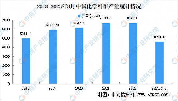 化学纤维是用天然高分子化合物或人工合成的高分子化合物为原料,经过制备纺丝原液、纺丝和后处理等工序制得的具有纺织性能的纤维。近年来,我国化学纤维产量呈现持续攀升的趋势。中商产业研究院发布的《2019-2023年中国化学纤维市场前景调查及投融资战略研究报告》显示,2018年我国化学纤维产量5011.1万吨,2022年增至6697.8万吨,复合年均增长率7.5%。2023年1-8月,我国化学纤维产量4620.4万吨,同比增长6.9%。