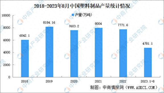 中商产业研究院发布的《2022-2027年中国塑料制品行业市场深度分析及发展趋势预测报告》显示,2022年中国塑料制品产量7771.6万吨,同比减少4.3%。2023年1-8月,塑料制品产量4781.1万吨,同比增长1%。