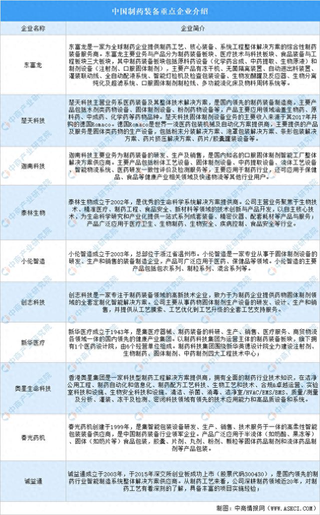 中国制药装备重点企业包括东富龙、楚天科技、迦南科技、泰林生物、小伦智造、创志科技、奥星生命科技、春光药机、诚益通。