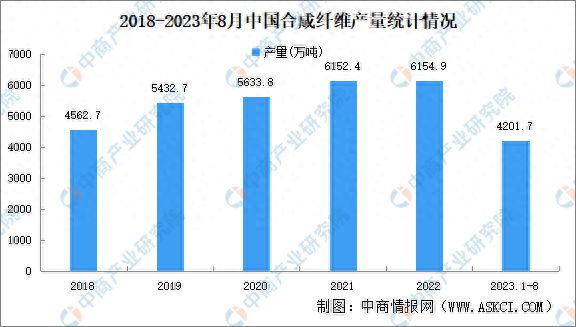 合成纤维是由合成的高分子化合物制成的,常用的合成纤维有涤纶、锦纶、腈纶、氯纶、维纶、氨纶、聚烯烃弹力丝等。合成纤维制造行业生产技术水平不断提高,再加上合成纤维性能的优越性日益突出,合成纤维产量稳步增长。中商产业研究院发布的《2022-2027年中国合成纤维产业市场深度分析及发展趋势预测报告》显示,2018年我国合成纤维产量4562.7万吨,2022年增至6154.9万吨,复合年均增长率7.8%。2023年1-8月,我国合成纤维产量4201.7万吨,同比增长6.4%。