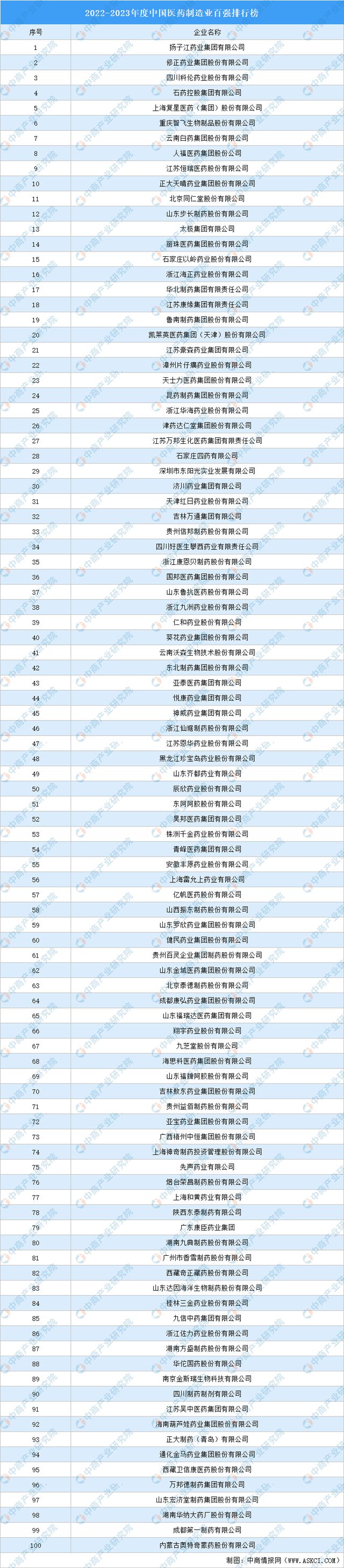 近期,全国工商联医药业商会发布了2022-2023年度中国医药制造业百强榜,扬子江药业集团有限公司、修正药业集团股份有限公司、四川科伦药业股份有限公司、石药控股集团有限公司、上海复星医药(集团)股份有限公司等100家企业上榜。