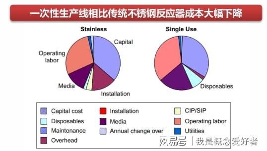 相比于传统的不锈钢反应罐,一次性反应系统成本大幅下降,从早期的资本投入到后面的安装、消毒、运营人力等等均实现了成本的下降,总成本下降接近50%,且一次性反应器前期建设周期也相对较短。