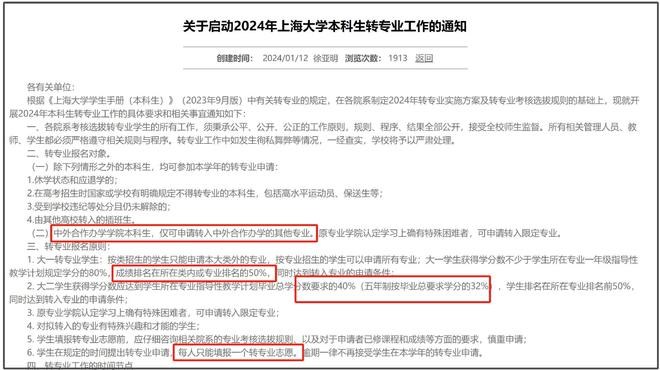 来看看具体的要求,中外合作专业只能转中外,前几年是有机会转其他的。另外就是大一和大二的区别,都要求专业排名50%。另外就是每人只能报考一个专业。其实这个要求算是每个学校的主流,大部分都是50%。但是要注意的是每个学校的要求不一样,同一个学校的每个专业不一样。这就是要提前了解关注的原因。