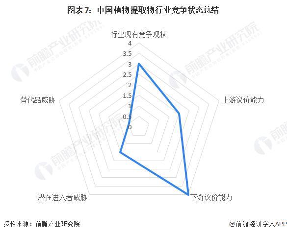 BOYU官方 博鱼BOYU官方 博鱼从五力竞争模型角度分析,目前,我国植物提取物属于新兴大健康原料行业,替代品威胁较小;细分产品多,市场集中度较低,部分细分市场形成垄断格局但整体来看现有企业竞争程度仍一般;上游供应商一般为植物原材料领域和植物提取物生产检验设备,其中原材料成本占比超过90%,行业对上游原材料议价能力较低;相较而言,植物提取物行业对制取设备议价能力则相对较强,主要系植物提取物设备制造厂商较多,行业产品选择余地较大,买家优势较为明显。