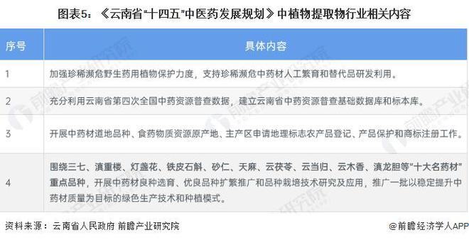 为推动生物医药和大健康产业创新升级和快速发展,做大做强生物医药和大健康产业,云南省政府于2022年颁布《云南省“十四五”中医药发展规划》,其中有关植物提取物行业的发展任务如下表所示: