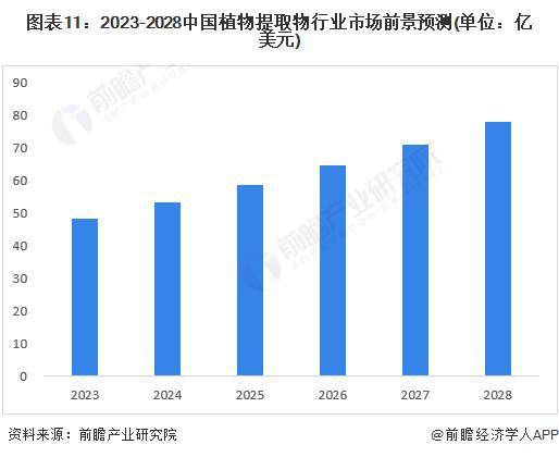 未来,随着我国中药产业和食品工业的逐步壮大,我国植物提取物行业的市场规模也将不断扩大。前瞻根据往年我国植物提取物行业市场规模增速测算,2023-2028年,中国植物提取物行业市场规模将以10%的复合增速增长,预计2028年,中国植物提取物行业市场规模将达78亿美元。