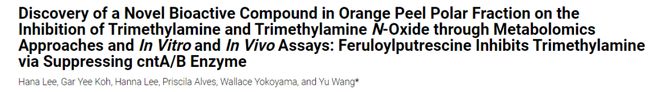 此外,通过橙皮中的非靶向和靶向代谢组学方法发现了一种新型化合物 FP,它对 cntA/B 酶和 TMA 形成具有抑制作用。这一发现强调了橙皮提取物减轻 TMA 和 TMAO 产生的能力不仅归因于多甲氧基黄酮,还与 FP 的存在有关。