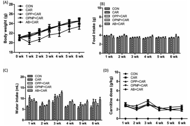 结果发现,各组间平均体重没有显著差异。此外,各组间的食物摄入量没有统计学上的显著差异。水摄入量可能会影响肉碱剂量,因为饮用水中含有肉碱。然而,各组间肉碱浓度没有显著差异。