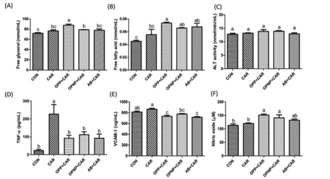 研究结果发现,与对照组相比,CAR治疗显著提高了血浆和尿液样本中的TMA和TMAO水平。CAR+OPP治疗显著降低了TMA和TMAO的产生。CAR+OPP比CAR+OPNP治疗更能有效地抑制TMA和TMAO。肉碱含量的结果表明CAR+OPP比CAR+OPNP具有更高的残留肉碱水平。CAR+AB治疗已被证明在抑制TMA和TMAO方面最有效,这与之前的研究结果一致。