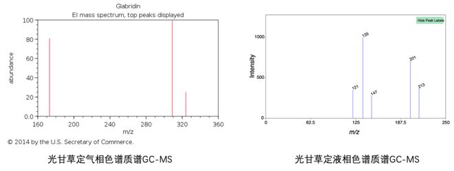 其次,光甘草定的化学鉴定已经完成。从光果甘草中分离出的光甘草定早已经经过了标准的化学鉴定,并且已经由美国化学会(American Chemical Society)下设的化学文摘服务社(Chemical Abstracts Service,简称CAS)分配了单独的CAS号59870-68-7,这是化学里对单一化学成分进行注册、识别区分的国际通用方式。