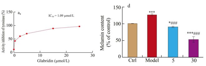 如上图所示,是光甘草定抑制可以生成黑色素的酪氨酸酶活性实验,能够显著抑制酪氨酸酶活性。