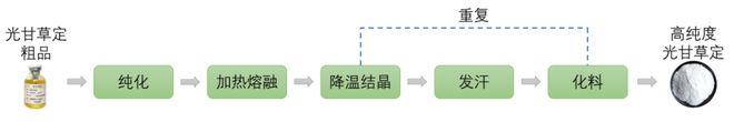 对于光甘草定来说,提纯一直是一个业内在攻克的难题,而每一次提纯突破都是对这种成分应用的极大助力。常规的光甘草定纯度是较低的,为了达到高纯度,国内某专利提供了一种利用熔融结晶制备高纯度光甘草定的方法,其实现路径也是较为复杂。