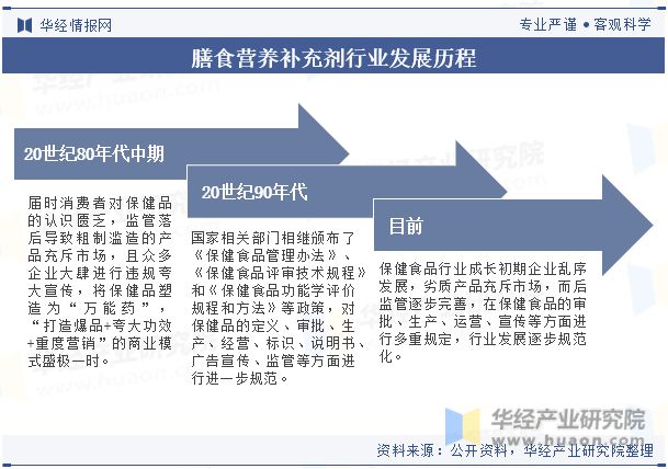 2016年,国务院发布《博鱼网站 BOYU“健康中国2030”规划纲要》,提出了健康中国建设的目标和任务。此后相继发布《关于实施健康中国行动的意见》、《保健食品标志规范标注指南》等政策文件,政策明确指出发展营养健康产业,将有利于促进膳食营养补充剂行业的发展。