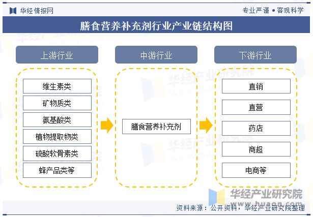 膳食营养补充剂行业的产业链包括原材料生产商、膳食营养补充剂企业、销售终端等环节。其中,上游是原材料生产商和贸易商,包括维生素类、矿物质类、氨基酸类、植物提取物类、硫酸软骨素类、辅酶类、鱼油类以及蜂产品类等多类原材料的生产商。下游是销售终端,包括直销商、直营店、药店、商超、电商等渠道。