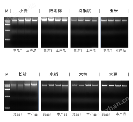 图2. 不同植物叶片,采用不同品牌提取试剂盒提取的核酸产物琼脂糖凝胶电泳质检结果