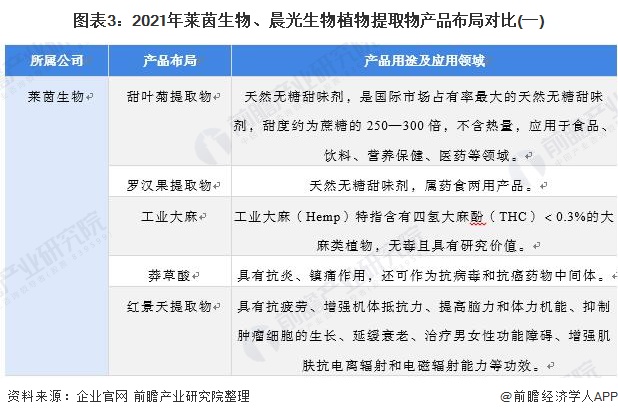 莱茵生物、晨光生物旗下均布局了多个植物提取物产品,其中莱茵生物主要产品包括罗汉果提取物、甜叶菊提取物等天然植物提取物产品以及天然中草药提取物产品;晨光生物主要研制生产四大系列产品:天然色素、天然香辛料和精油、天然营养及药用提取物、油脂和蛋白,产品种类共计80多种。整体来看晨光生物产品线更为全面。