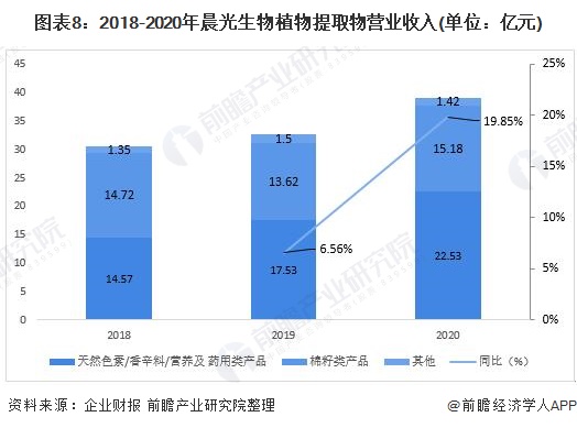 在经营业绩方面,2020年,莱茵生物植物提取物营收达到6.23亿元,同比增长20.04%,近三年来业绩保持高速增长态势;晨光生物方面,2018-2020年植物提取物业务也呈现稳步增长态势,2020年整体植提业务营收达到39.13亿元,同比增长19.85%,其中香精香料等植提产品营收达到22.53亿元,占比呈逐年提高趋势。