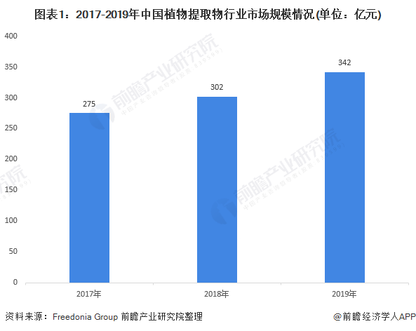 随着全球植物提取物需求的迅速增长,我国植物提取物行业的市场规模也呈现增长态势。前瞻根据近年来全球植物提取物市场规模以及中国市场规模占比测算得出,2019年,我国植物提取物市场规模达342亿元,年复合增长率为11.52%。