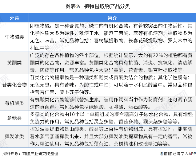 植物提取物种类繁多,目前已进入工业化提取的种类超过300种。根据提取物中主要成分可分为生物碱类、苷类、黄酮类、有机酸类、多糖类和挥发油类。