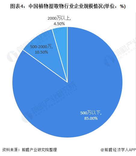 我国拥有植物提取物相关企业2000多家,目前看来并未形成明显的龙头优势企业,规模以上企业(年销售额在2000万元以上)占比仅为4.5%;85%为年销售额在500万以下。