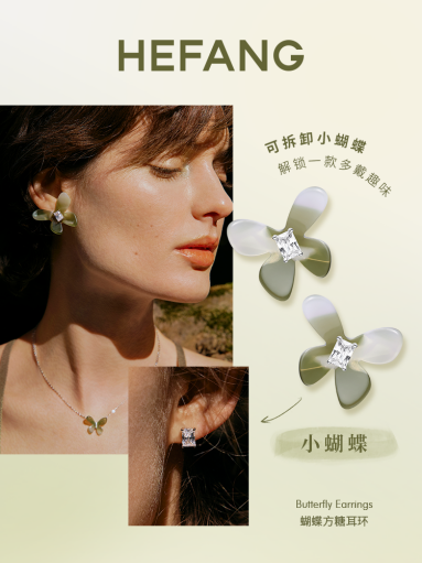 春日里,蝴蝶羽化新生,繁花明媚绽放,设计师打造蝴蝶方糖耳环,演绎春日灵动与生命之美。环保板材还原高级感的植物肌理与剔透光影效果,蝴蝶翅膀可拆卸,方糖石单独佩戴,简约通勤。两款自然系配色可选,奶油黄温柔优雅,橄榄绿清新灵动。蝴蝶玄学寓意“好运随身”,成为 2024 年的高能量礼物。