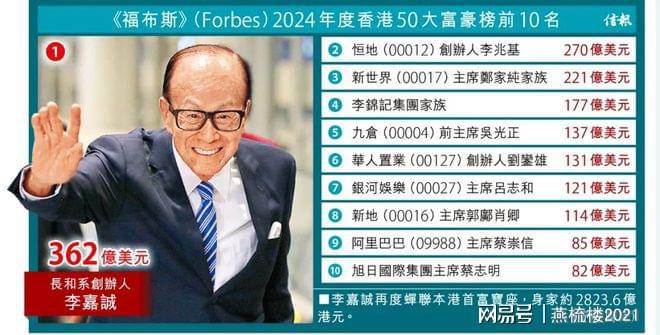 《福布斯》杂志近期公布了2024福布斯香港50大富豪榜,李嘉诚以362亿美元(约合人民币2600亿元)再次登顶,资产总额较第二名的李兆基高出近百亿美元,可谓遥遥领先。