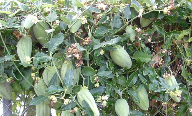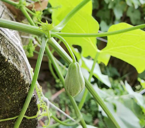从图片我们可以看出,阿鲁藤的叶子偏细长,而佛手瓜的叶子阔大,有棱沟,藤蔓较细而短。