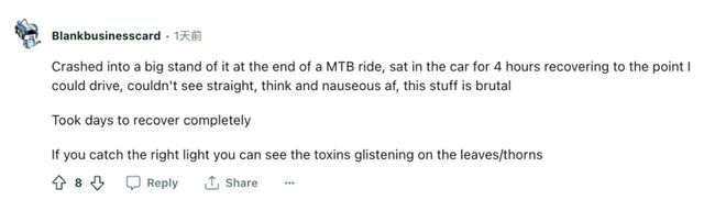 还有一名网友表示,他在一次山地车骑行结束时碰到了荨麻,在车里坐了4个小时才恢复到可以开车的程度, 花了几天时间才完全恢复。