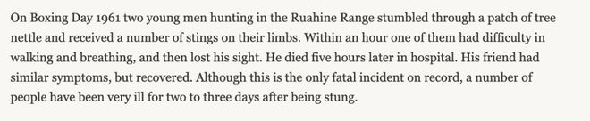 1961年节礼日,两名年轻男子在Ruahine Range打猎时跌倒在一片荨麻丛中,四肢被多处蜇伤。