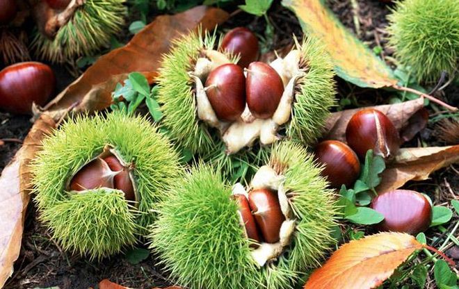 板栗的果实外面包着层细毛针刺状外壳,刺毛极为细密。成熟后外壳裂开,露出深褐色的板栗,一般里面包着2到3颗板栗。