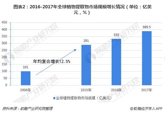 但是植物提取物行业的线年美国的DSHEA(Dietary Supplement Health and Education Act of 1994)发布之后,美国FDA正式接受植物提取物作为一种食品补充剂(A Dietary Supplement)使用,使得植物提取物的发展得以真正升级。近年来,世界范围内,随着植物提取物全球认可度提高,植物提取物行业规模快速增长,尤其是欧美等发达国家和地区,对植物提取物的需求稳定增长,大大刺激了行业的发展。2016-2017年,植物提取物行业全球市场规模呈不断上升趋势,2017年全球植物提取物销售额达389.5亿美元,同比增长16.97%,年均市场发展速度约为12.5%。