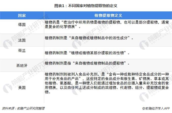 植物提取物是一个新兴行业,尽管十九世纪初欧洲一些国家就开始着手生产并应用植物提取物,但那时还只是萌芽状态,不成规模,更谈不上构成一个产业。直到19世纪80年代初,在全世界掀起一股回归自然的狂潮,人们在感觉到化学合成药物的负作用之后对纯天然的中草药产生一种安全感,从而使得植物提取物的发展迅猛而势不可挡,随之德国、英国、美国、意大利等国家就开始着手生产中草药提取物,并用于中药保健食品。不同国家对植物提取物的定义不同,但尽管存在传统药物缺陷和文化背景的差异,作为中药组成部分的植物提取物,由于其部分有效成分的已知性和可量化,已被西方社会普遍接受。