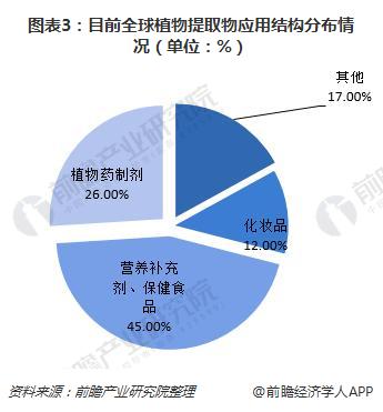 在逐渐巨大的规模下,我们可以看到目前全球植物提取物的应用结构分布情况,营养保健食品已经成为植物提取物的最大需求市场,2017年占比已经达到45%,其次为植物药制剂,占比为26%,化妆品占比12%。在西方主要消费市场,特别是欧洲市场,植物提取物是植物药制剂的主要原料,而在北美、日本市场,则主要应用于营养补充剂、保健食品、化妆品等行业,是天然保健品市场的核心产品。