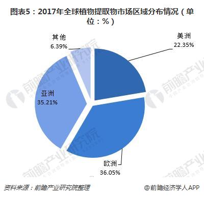 在植物提取物在营养补充剂以及保健食品方面需求的不断增大,全球草药市场规模也在不断增长的背景下,全球植物提取物市场继续保持上涨,已经形成亚洲和欧洲占主导的局面。从下图我们可以看到,2017年,全球植物提取物市场欧洲占比最大,为36.5%,其次为亚洲,占比35.21%,亚欧合计占比已达71.26%。